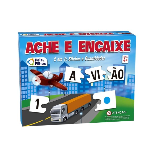 Embalagem contém  2 (dois) tipos de Ache e Encaixe: - Ache e Encaixe (Palavras): Onde cada ­figura (desenho) se encaixa com a palavra correspondente, que está dividida em sílabas (8 fichas com 4 peças cada) e Ache e Encaixe (Números): As combinações para o encaixe estão divididas em três partes: número, ­figuras e bolinhas ( 10 fichas com números e figuras com 3 peças cada. / Idade: + 4 Anos / Participantes: 1 ou Mais Jogadores / Registro Inmetro: 003934/2019, OCP0046.