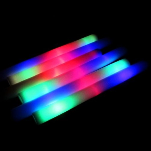 Bastão de espuma com iluminação de LED nas extremidades e centro. São 3 funções de iluminação com velocidades alternadas nas cores verde, vermelha e azul.